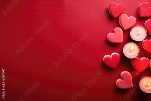 Red Background With Empty Space With Pink Heartshaped Candles On The Side, Top View. Generative AI