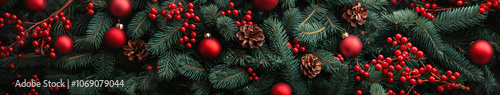 Red balls decoration and green Christmas tree, cone close-up background. Winter template, banner concept for Christmas, New Year and sale season. Web card and backdrop with space for text