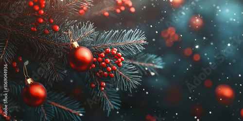 Red balls decoration and green Christmas tree on dark grey snowy background. Winter flat lay template, banner concept for Christmas, New Year and sale season. Web card and backdrop with space for text