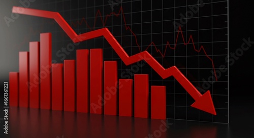Red bar graph and downward arrow depicting a financial market decline and economic downturn.