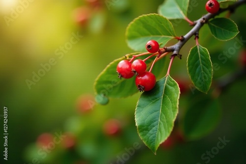 Red berries on Cotoneaster coriaceus branches, autumn foliage, green leaves