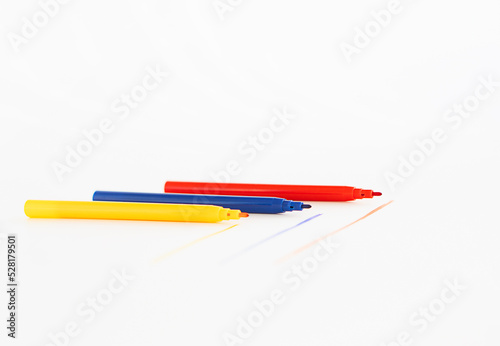 Red, blue and yellow markers on a white table. Drawn colored lines. Drawing tools.