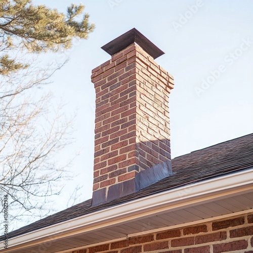 Red brick chimney on suburban house rooftop in sunlight