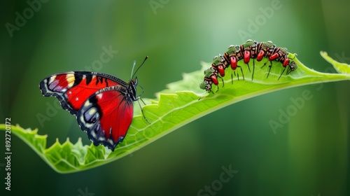 Red butterfly, from caterpillar to chrysalis to fully emerged butterfly, perched on a green leaf