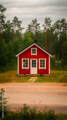 Red Cabin Stands Serenely in a Forest Clearing Under a Cloudy Sky in a Peaceful Retreat