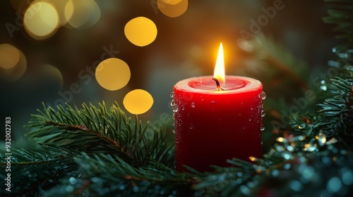 Red candle on pine branch with bokeh