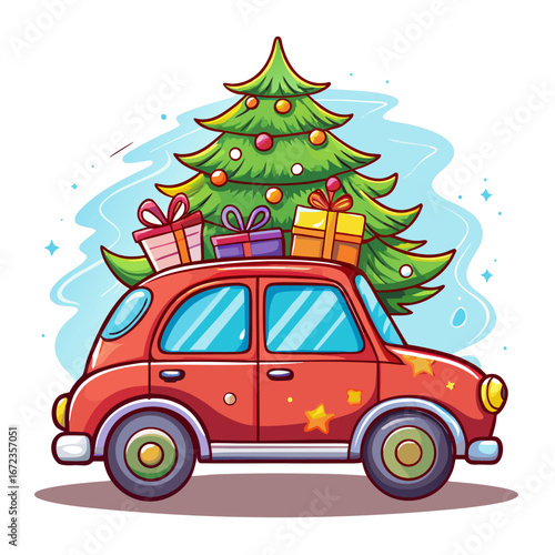 Red car carrying christmas tree and gifts isolated on white background isolated on transparent background