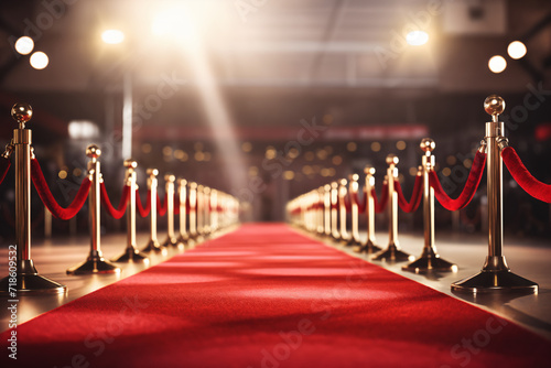 Red carpet rolling out in front of glamorous movie premiere with paparazzi in the background