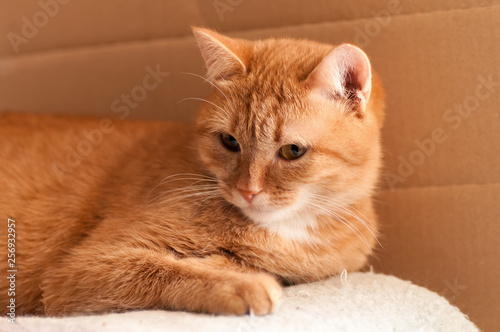 red cat lies and looks to the left, a rare red color breed "Scottish straight"