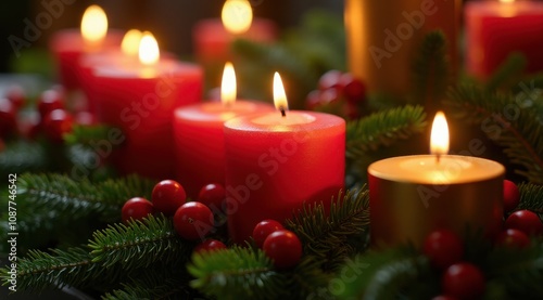 Red Christmas candles surrounded by festive greenery and berries for a warm holiday feel