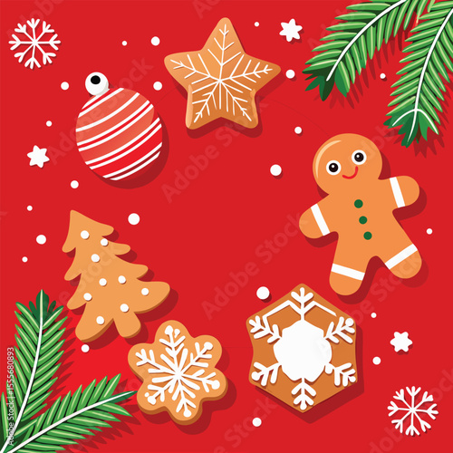 Red Christmas gingerbread background. Xmas design with winter cookies, fir branches, snowflakes and snow. Empty space for your text. Template for cards, banner, poster.