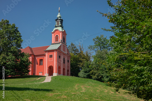 Red church on Rozik hill above Ljubljana surrounded by lush green trees and grassy meadows. Beautiful scenery around a tyoical church.