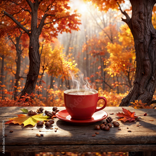 Red coffee cups sit on wooden tables and scatter yellow, orange, brown leaves, acorns and chestnuts on the floor to create a cozy autumn atmosphere.