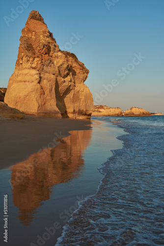 Red colored limestone rock reflecting in the low tide water. Praia do Amado in Algarve, Portugal