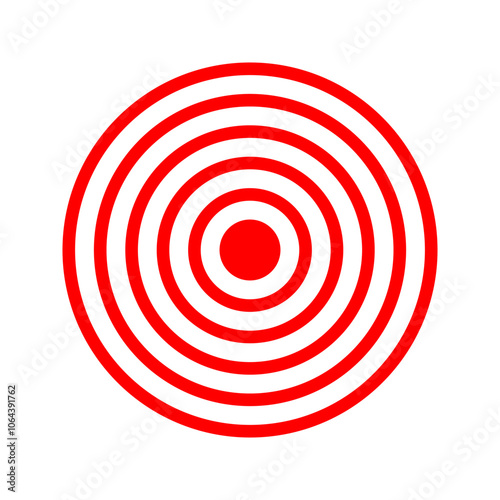 Red concentric circles. Pain localization icon. Sore or inflammation symbol. Coverage or vibration sign. Shockwave, radar or sound signal pictogram isolated on white background. Vector illustration.