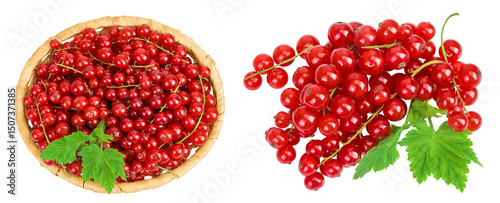 Red currant berries in a wicker basket with leaf isolated on white background. Top view. Flat lay