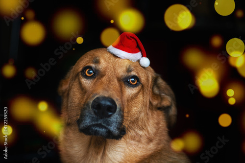 red cute puppy dog wear santa's hat on dark background. merry christmas and new year
