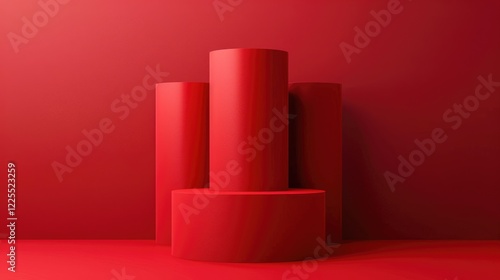 Red cylinder podium mockups on table with rich background for presenting products in modern style. Template for advertising and design.