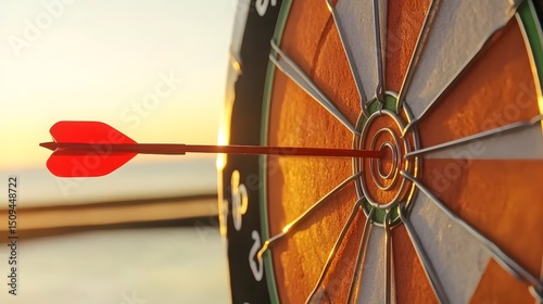 Red Dart Arrow Hitting Bullseye on Dartboard at Sunset