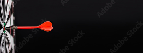 Red dart arrow on center of dartboard. Concept o business target, success and win. Copyspace.