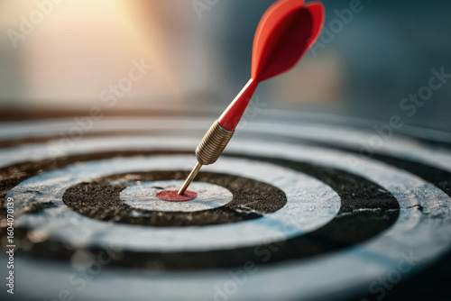 Red Dart Hitting Bullseye on Target, Precision and Success Concept, Close-Up Photography