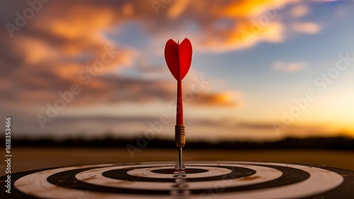 Red dart in bullseye of dartboard at sunset with colorful clouds target hitting