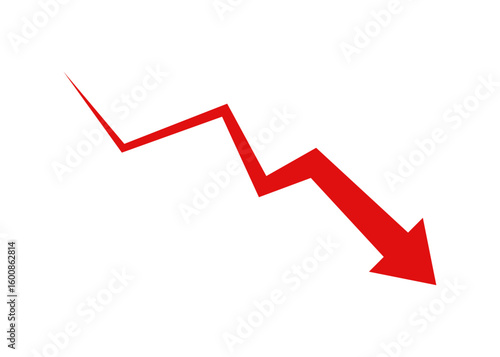 Red downward jagged arrow icon symbolizing decline, loss, negative trend, financial drop, and business decrease