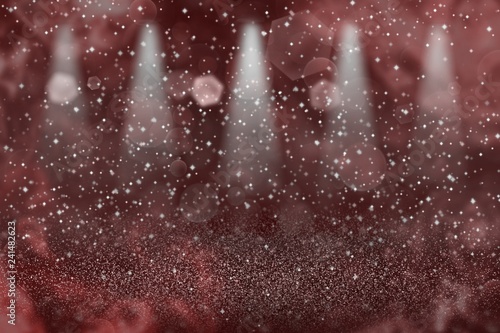 red fantastic shiny glitter lights defocused stage spotlights bokeh abstract background with sparks fly, festival mockup texture with blank space for your content