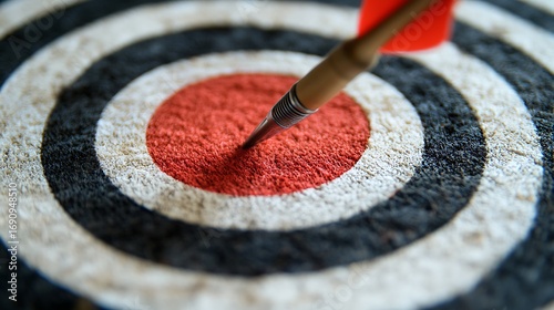 Red feathered dart strikes the bullseye center of a weathered circular target board representing success and precision