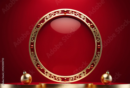 red festive background christmas ornaments gold frame minimal round display