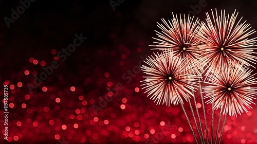 Red fireworks display on dark background with bokeh lights.