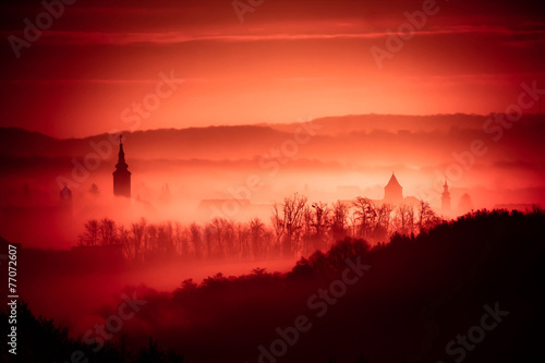 Red foggy dawn in town of Krizevci