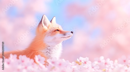 Red fox serenely rests amidst a field of delicate pink blossoms under a soft, pastel sky