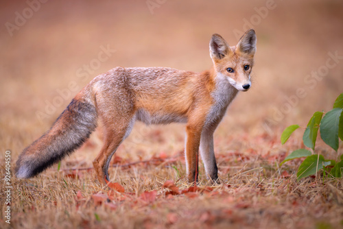 Red fox Vulpes vulpes. A fox in a meadow. Wild young fox. Close up.