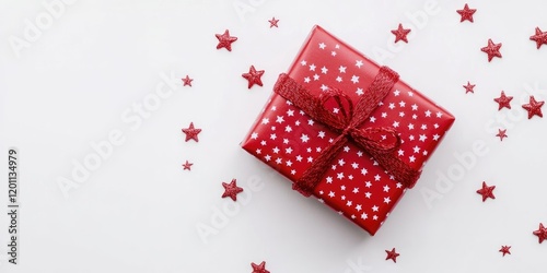 Red gift box adorned with white stars and a red ribbon, centered on a white background, surrounded by scattered red decorative stars.