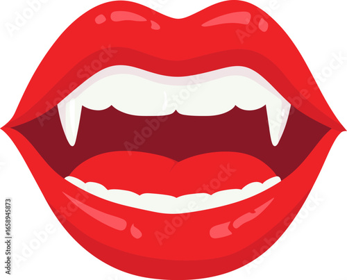 Red lips with vampire fangs open in a playful expression for a Halloween-themed design isolated on transparent background. Vector illustration.