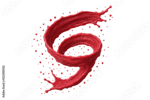 Red liquid spiraling dynamically, forming elegant droplet patterns against transparent backdrop, conveying energetic motion and vivid color for graphic design compositions