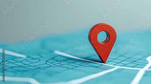 Red location pin marker on turquoise city map background with street grid pattern, modern minimal composition for navigation and GPS concepts.