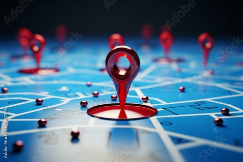 Red locator and blue location pin symbolize map search concept