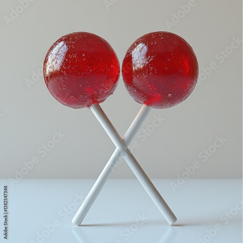 Red Lollipops Crossed in X Shape on White Background Hyper-Realistic Still Life
