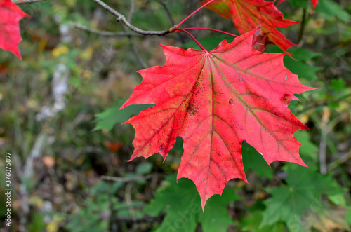 Red maple leaf hanging on a tree branch in the forest. The concept of the onset of autumn and cooling. September 1st