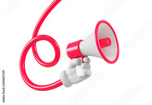 Red megaphone in cartoon character flexible twisted hand. Close up breaking news metaphor, disclosure of information concept. 3d rendering
