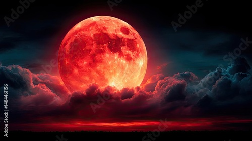 Red moon behind black clouds at night with abstract fire concept. A stunning view of a red moon shining through dark clouds.