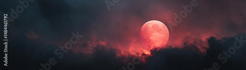 Red moon behind black clouds with abstract fire and smoke concept. A dramatic sunset with a glowing moon and vibrant clouds.