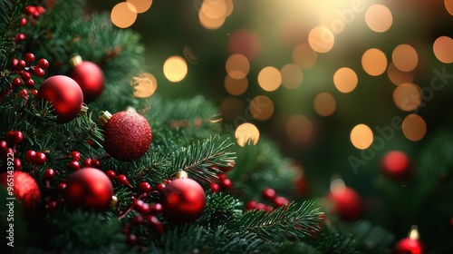 Red ornaments and pine branches create a festive atmosphere during a joyful holiday season in a warmly lit setting