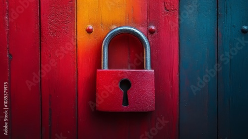 Red Padlock on Colorful Wooden Door: A close-up shot of a red padlock on a colorful wooden door, symbolizing security, protection, and privacy.