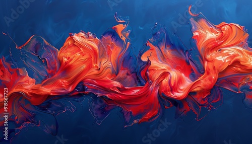 Red paint swirling in dynamic patterns against a deep blue backdrop