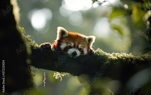 Red Panda Resting on Mossy Branch in Sunlight Dappled Forest