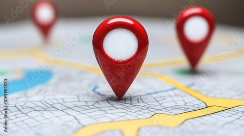 Red pin on map, highlighting specific location among multiple destinations for travel planning and navigation