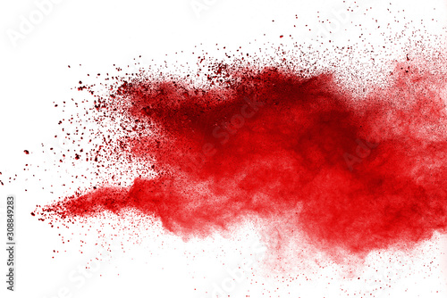 Red powder explosion on white background. Colored cloud. Colorful dust explode. Paint Holi.